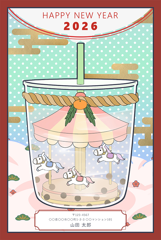 原宿・竹下通りのにぎやかでポップな雰囲気をイメージした年賀状デザインです。原宿らしさを象徴するモチーフとしてタピオカドリンクを取り入れ、午年にちなみメリーゴーランドの馬を主役にすることで、非日常感のある「ゆめかわいい」世界観を表現しています。